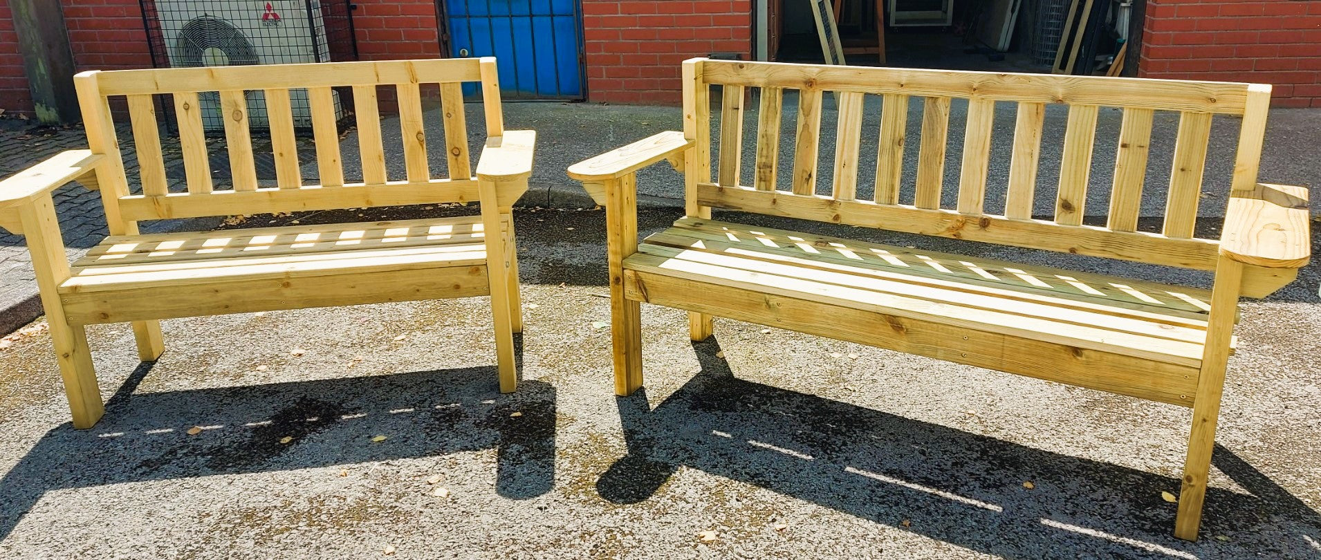Solid pressure treated garden bench. Spacious 2 seater. Featuring jointed and glued legs for strength and durability. Easy self assembly just 4 bolts (17mm spanner required) and 4 screws.